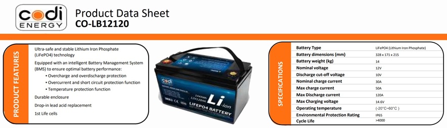 12.8VАкумулятор CODI LFP12120 12V 120Аh 1536Wh LiFePO4